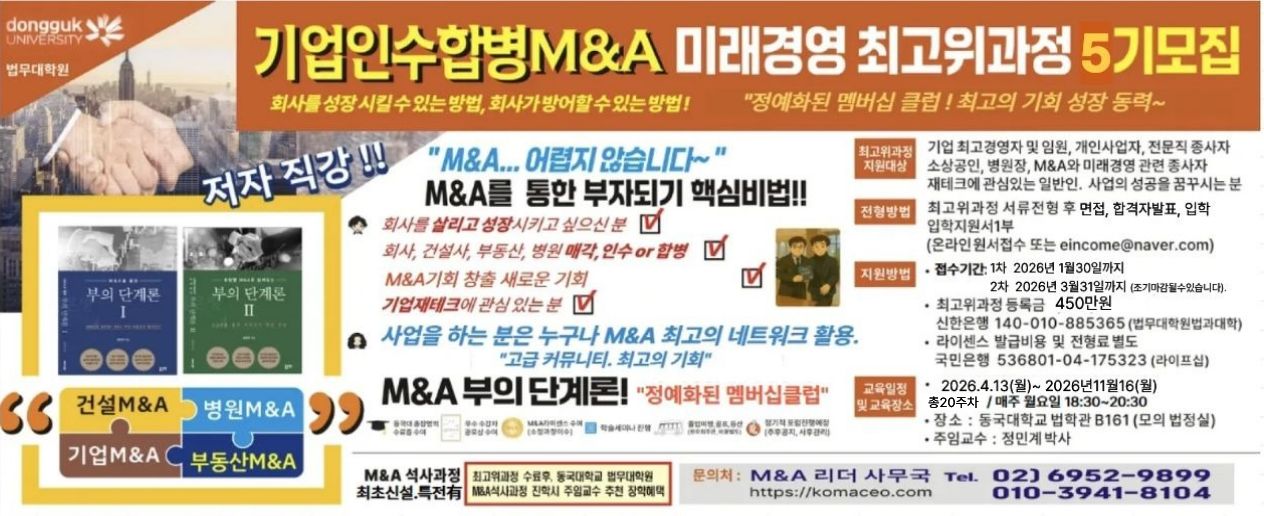 동국대학교 법무대학원 [기업인수합병(M&A) & 미래경영 리더십 최고위과정]이 열화 같은 성원 속에 제5기 원우를 모집한다.